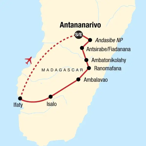 Začetek in zaključek v Antananarivu, se boste podali skozi oddaljene deževne gozdove, neokrnjene plaže, vijugaste reke in edinstvena mesta z lastno kulturo. Upoštevajte, da to potovanje vključuje nekaj kampiranja in rečnih križarjenj, ki so precej osnovna; to ni razkošna tura, je pa pristna.